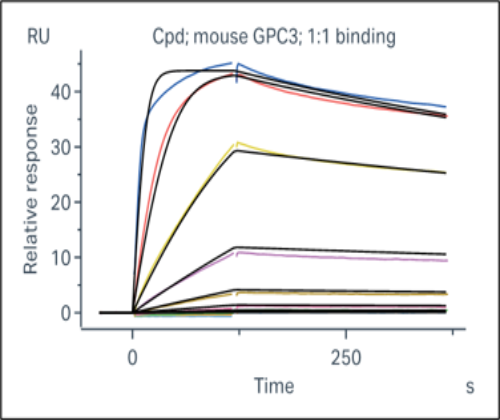 活性验证:SPR法检测Biotin-GPC3蛋白的活性:将Biotin-GPC3固定到CM5芯片上,不同浓度的化合物流经Biotin-GPC3蛋白的固定表面,并记录响应信号。动力学拟合结果如下,kD值约为5.90x10-9 M。