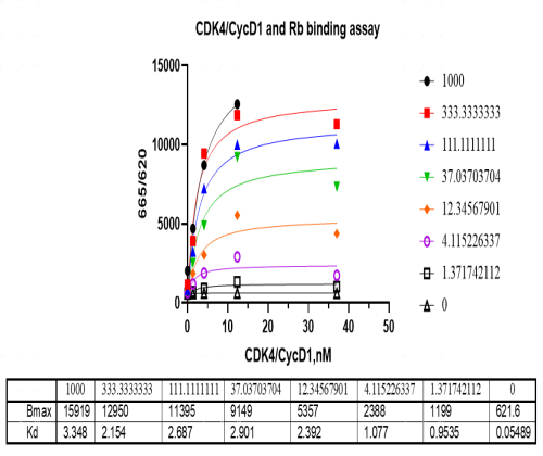 活性验证:Binding法检测RB1蛋白的活性:将CDK4/CycD1蛋白、RB1和Anti-6His mAb Tb-Conjugate & Anti-GST mAb XL665-Conjugate溶液,在25℃下孵育60分钟,最后在BMG上读取665nm/620nm比值。