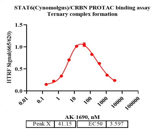 活性验证:HTRF法检测STAT6蛋白的活性:将STAT6蛋白、化合物、CRBN、对应的供体和受体在25℃下孵育60分钟,最后在BMG上读取665nm/620nm荧光信号的比值。