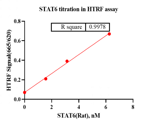 描述:带有N端Avi-3C-His标签的重组兔STAT6蛋白先通过Ni亲和层析纯化,再通过3C酶去除生物素标签后并进行SEC纯化。STAT6蛋白在HTRF检测中显示出高活性。