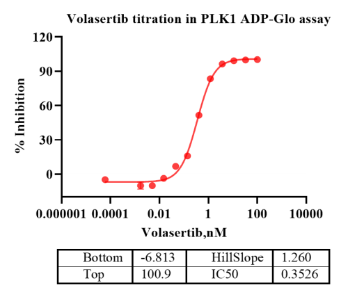 活性验证:ADP-Glo法检测PLK1蛋白的活性:将PLK1蛋白、ATP和底物在25℃下孵育60分钟,加入ADP-Glo试剂,最后在BMG上读取RLU信号。