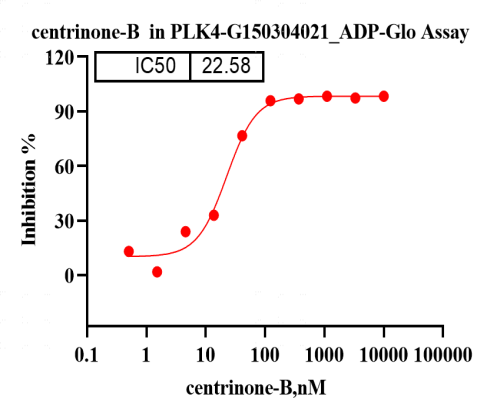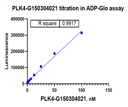 活性验证:ADP-Glo法检测PLK4蛋白的活性:将PLK4蛋白、ATP和底物在25℃下孵育60分钟,加入ADP-Glo试剂,最后在BMG上读取RLU信号。