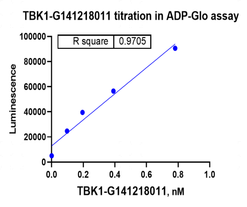 活性验证:ADP-Glo法检测TBK1蛋白的活性:将TBK1蛋白、ATP和底物在25℃下孵育60分钟,加入ADP-Glo试剂,最后在BMG上读取RLU信号。