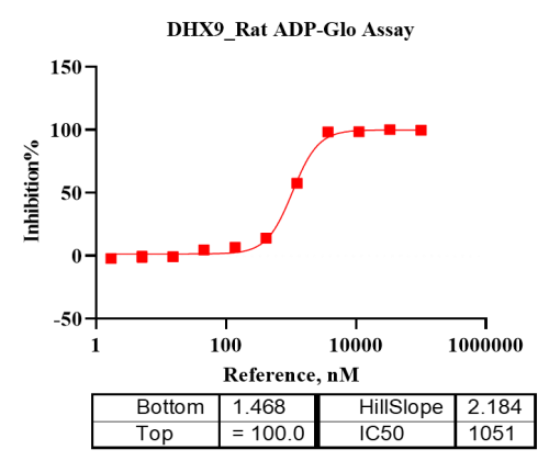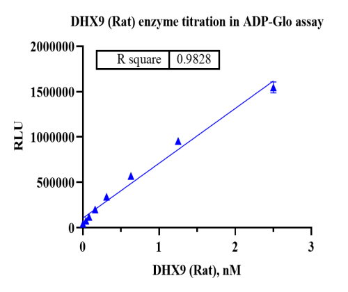 活性验证:ADP-Glo法检测Biotin-DHX9蛋白的活性:将Biotin-DHX9蛋白、ATP和底物在25℃下孵育60分钟,加入ADP-Glo试剂,最后在BMG上读取RLU信号。