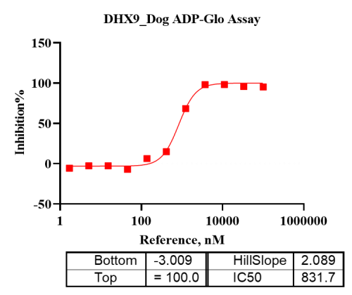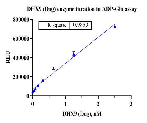 活性验证:ADP-Glo法检测Biotin-DHX9蛋白的活性:将Biotin-DHX9蛋白、ATP和底物在25℃下孵育60分钟,加入ADP-Glo试剂,最后在BMG上读取RLU信号。