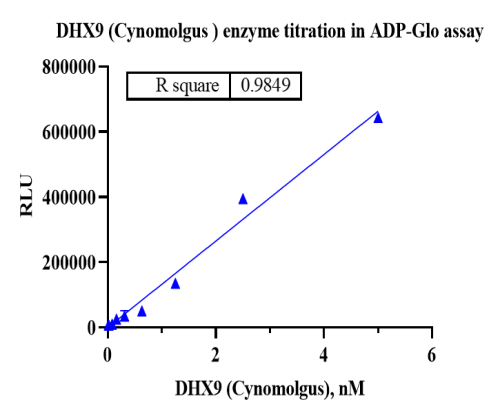 活性验证:ADP-Glo法检测Biotin-DHX9蛋白的活性:将Biotin-DHX9蛋白、ATP和底物在25℃下孵育60分钟,加入ADP-Glo试剂,最后在BMG上读取RLU信号。