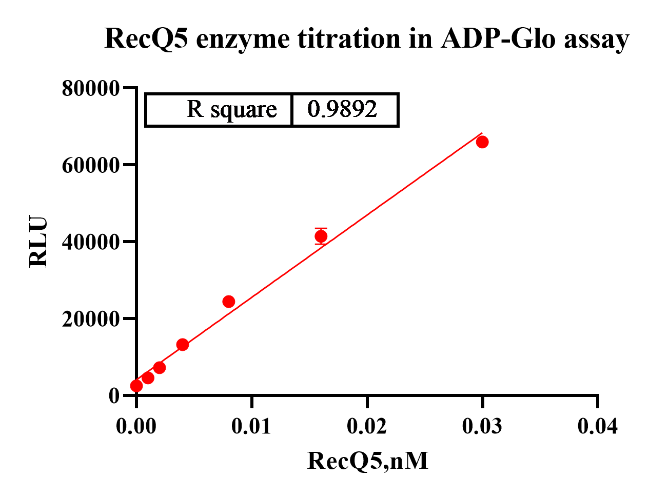 活性验证:ADP-Glo法检测RecQ5蛋白的活性:将RecQ5蛋白、ATP和底物在25℃下孵育60分钟后,加入ADP-Glo试剂,最后在BMG上读取RLU信号测。