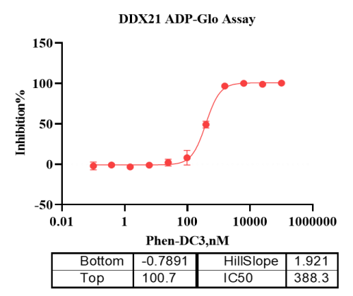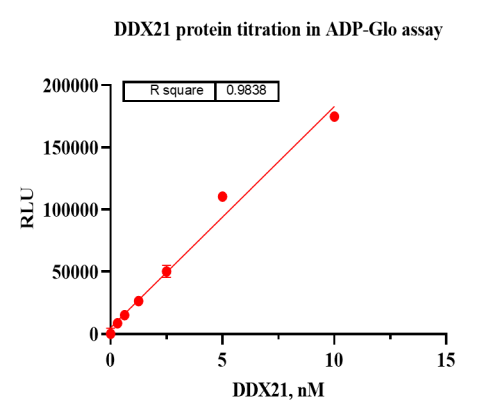 活性验证:ADP-Glo法检测DDX21蛋白的活性:将DDX21蛋白、ATP和底物在25℃下孵育60分钟,加入ADP-Glo试剂,最后在BMG上读取RLU信号。