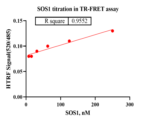 活性验证:TR-FRET法检测SOS1蛋白的活性:将SOS1蛋白、底物、对应的供体和受体在25℃下孵育180分钟,最后在BMG上读取520nm/485nm荧光信号的比值。