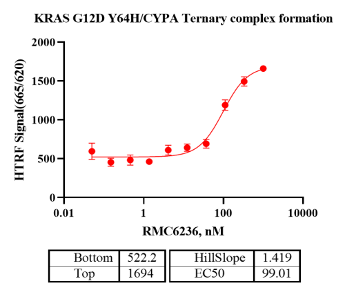 活性验证:HTRF法检测Biotin-KRAS[G12D/Y64H]蛋白的活性:将Biotin-KRAS[G12D/Y64H]蛋白、底物、对应的供体和受体在25℃下孵育60分钟,最后在BMG上读取665nm/620nm荧光信号的比值。